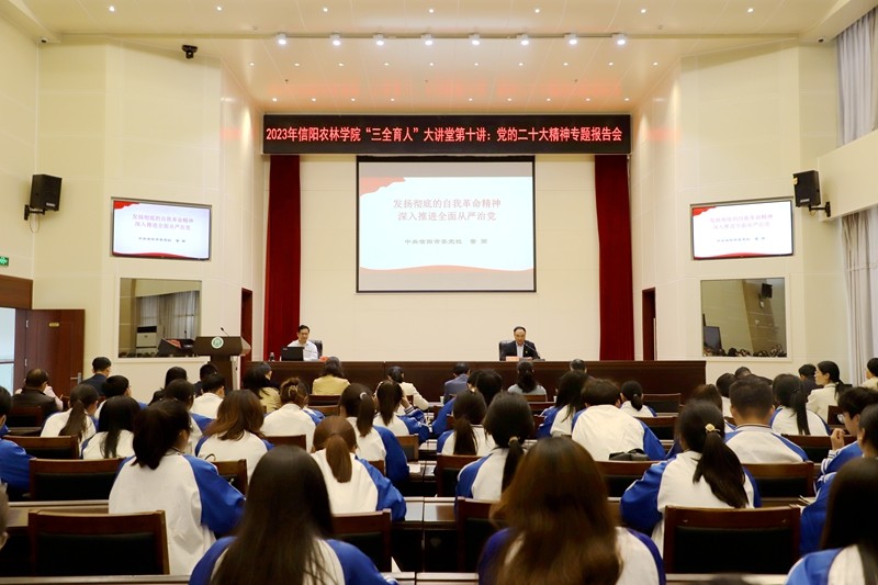 為扎實(shí)開展學(xué)習(xí)貫徹習(xí)近平新時(shí)代中國(guó)特色社會(huì)主義思想主題教育,學(xué)習(xí)宣傳貫徹黨的二十大精神,深刻領(lǐng)會(huì)黨的自我革命精神要義,4月21日下午,信陽(yáng)農(nóng)林學(xué)院舉辦黨的二十大精神之“黨的自我革命”專題報(bào)告會(huì)。師生同堂共學(xué),同頻共振,深刻學(xué)習(xí)領(lǐng)悟黨百年奮斗的重大成就和寶貴經(jīng)驗(yàn),深學(xué)細(xì)悟勇于自我革命的內(nèi)涵和本質(zhì)要求。