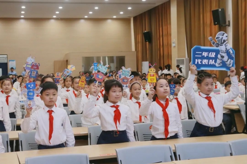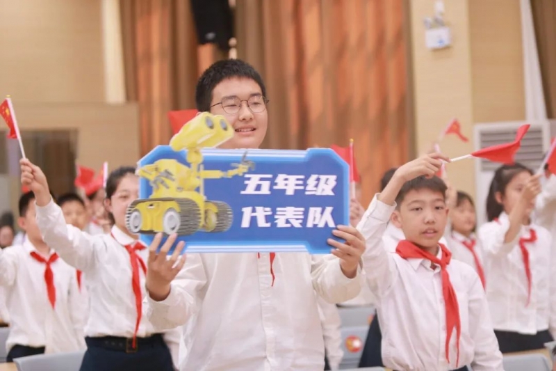 在開幕式上,孩子們在舞臺中央綻放光芒。整齊的動作、嘹亮的口號,年級代表方陣,展現(xiàn)出了緯五路第二小學(xué)孩子們獨特的氣質(zhì)。各式各樣的機器人吉祥物,彰顯著孩子們的自信和活力。