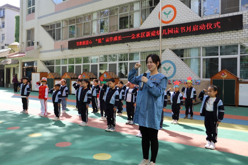 伴隨著莊嚴的升旗儀式,讀書月啟動儀式正式開始!在金水區(qū)新建幼兒園保教室副主任郭炎麗的引領下,全體幼兒舉起右拳一起宣誓:我宣誓要與好書為伴,堅持每天讀書,閱讀經(jīng)典,閱讀文明,勤于思考,善于積累,浸潤書香,快樂閱讀!