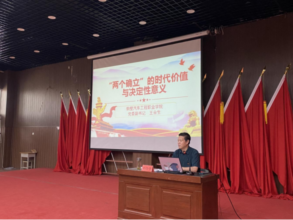 為深入開(kāi)展學(xué)習(xí)貫徹習(xí)近平新時(shí)代中國(guó)特色社會(huì)主義思想主題教育,根據(jù)學(xué)院主題教育讀書(shū)班工作安排,5月17日下午,鶴壁汽車(chē)工程職業(yè)學(xué)院黨委副書(shū)記王合生以“‘兩個(gè)確立’的時(shí)代價(jià)值與決定性意義”為題講授專(zhuān)題黨課。學(xué)院全體黨員及馬克思主義學(xué)院全體教師聆聽(tīng)了課程。