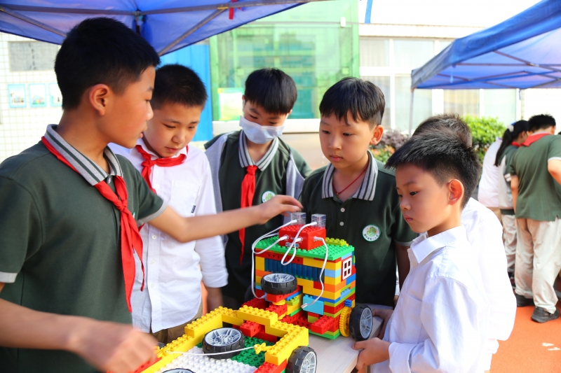 本次科技活動(dòng)周主要開展的活動(dòng)有創(chuàng)作類、實(shí)驗(yàn)類、科普類、闖關(guān)類、研學(xué)類。同學(xué)們制作的手工作品帶你置身科技的海洋。牛頓擺、電風(fēng)扇、水力風(fēng)車、水火箭、滑雪臺(tái)活靈活現(xiàn)。利用樂高積木搭建的各種模型吸引了很多同學(xué)的興趣。一個(gè)個(gè)科學(xué)作品呈現(xiàn)在同學(xué)們的眼前,引得同學(xué)們駐足觀看,驚嘆不已。