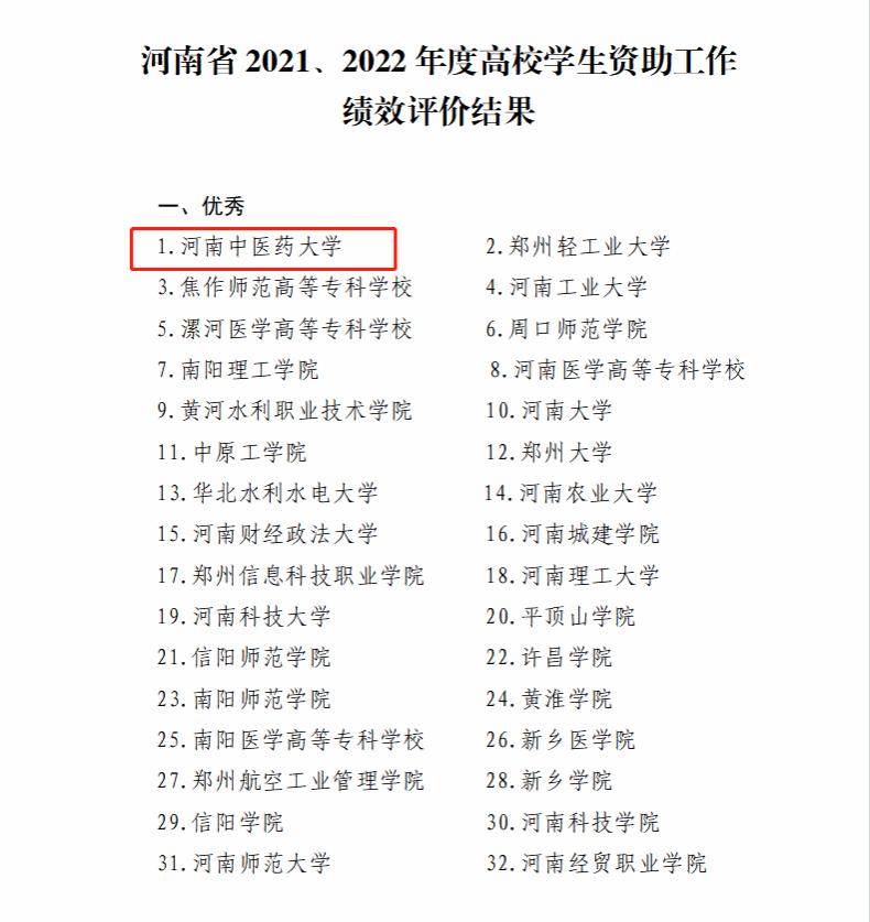 日前,河南省教育廳、國家開發(fā)銀行河南省分行發(fā)布了《全省高校和省屬中職學(xué)校2021、2022年度學(xué)生資助工作績效評價結(jié)果的通知》,河南中醫(yī)藥大學(xué)在全省參評的155所高校中榮獲優(yōu)秀等次第一名,這是學(xué)校第11次位列全省高校學(xué)生資助工作績效評價優(yōu)秀等次第一名,學(xué)校《千里寄喜報,家校育英才》被認(rèn)定為全省學(xué)生資助工作創(chuàng)新項(xiàng)目。