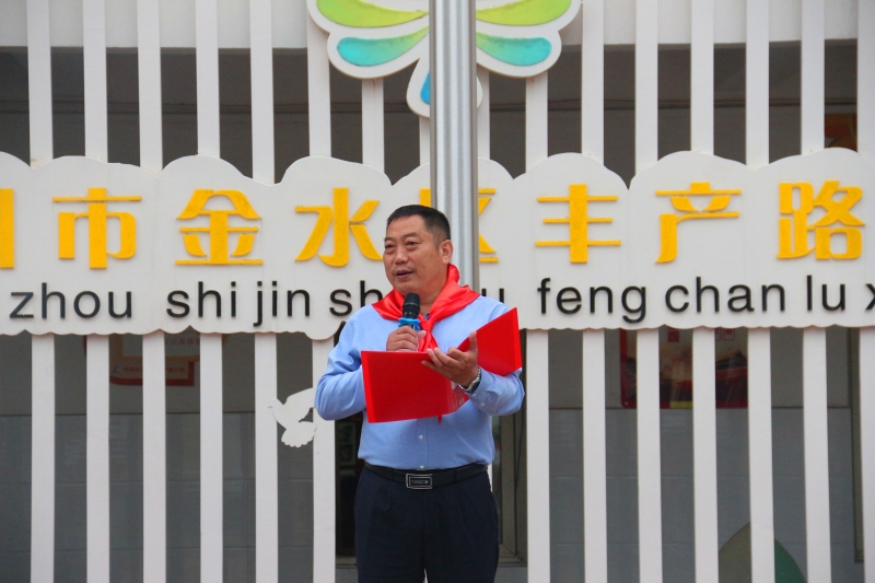 在星星火炬下,大隊(duì)委員劉晨菲宣讀新隊(duì)員名單,五年級(jí)的少先隊(duì)員們向新隊(duì)員授紅領(lǐng)巾并互相敬隊(duì)禮,紅旗一角系胸前,中國未來在我肩。光榮的少先隊(duì)員離不開優(yōu)秀的隊(duì)伍,離不開優(yōu)秀的指引者。金水區(qū)豐產(chǎn)路小學(xué)黨支部書記、校長(zhǎng)陳鵬為八個(gè)新中隊(duì)授中隊(duì)旗,副校長(zhǎng)李廣英為各中隊(duì)輔導(dǎo)員老師頒發(fā)聘書。隊(duì)旗迎風(fēng)飄揚(yáng),新隊(duì)員們神采奕奕,他們驕傲地挺起胸,在德育副主任馮真真的帶領(lǐng)下舉起右拳莊嚴(yán)宣誓。錚錚誓言,鏗鏘有力,稚嫩而又堅(jiān)毅的臉龐表現(xiàn)出他們的堅(jiān)定信念和決心。