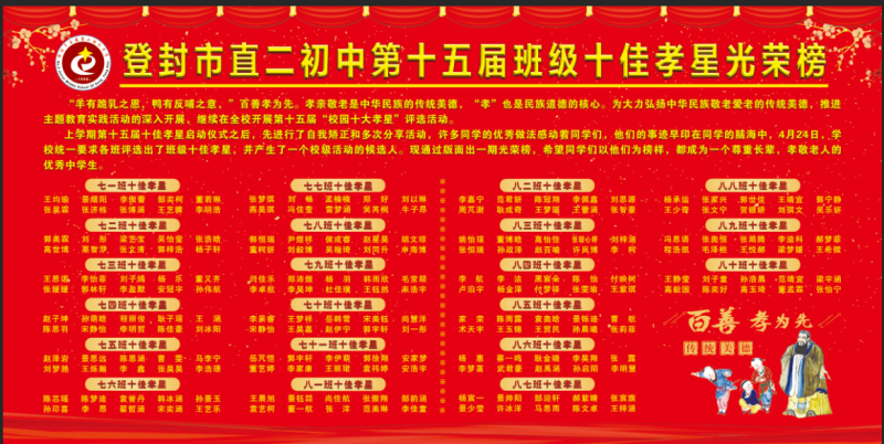 為大力弘揚(yáng)中華民族敬老愛(ài)老傳統(tǒng)美德,踐行社會(huì)主義核心價(jià)值觀,推進(jìn)精神文明教育實(shí)踐活動(dòng)深入開(kāi)展,登封市市直二初中從2008年開(kāi)始在學(xué)校開(kāi)始首屆“十佳孝星”評(píng)選活動(dòng),對(duì)弘揚(yáng)民族美德、塑造高尚人格起到巨大榜樣作用。