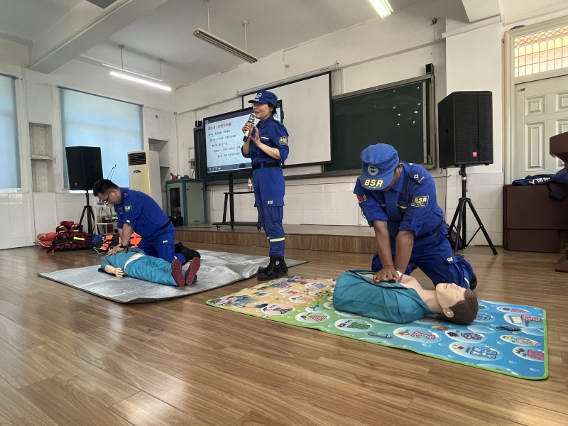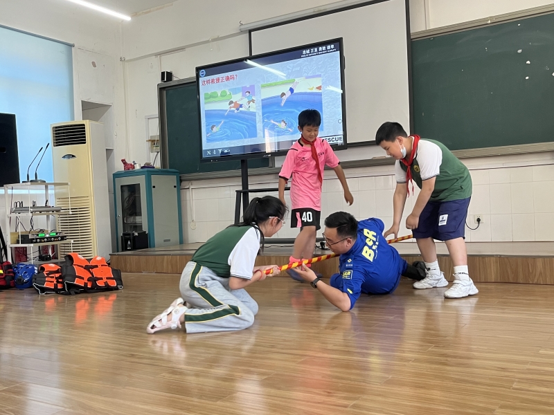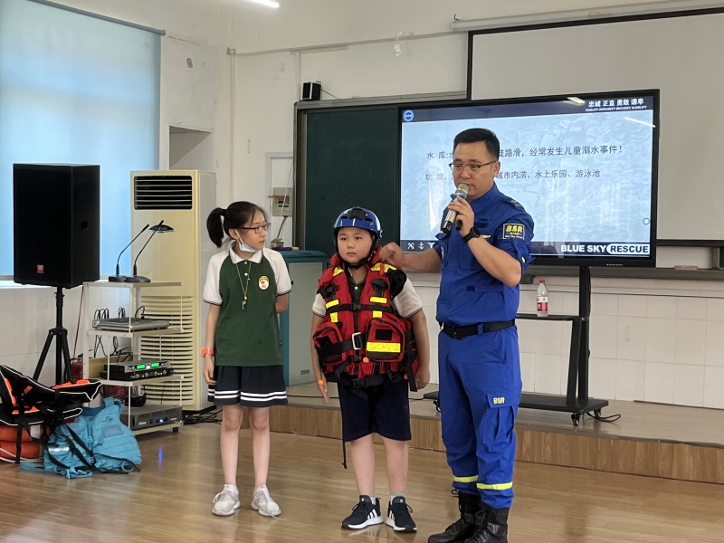 活動(dòng)中,藍(lán)天救援隊(duì)志愿者從牢記防溺水措施、如何預(yù)防溺水、如何辨別溺水、發(fā)現(xiàn)溺水時(shí)如何自救、如何科學(xué)正確施救他人等方面進(jìn)行講解,展示了溺水事故救援現(xiàn)場(chǎng)的圖片,用真實(shí)的案例和數(shù)據(jù)講述了溺水事故的危害,現(xiàn)場(chǎng)演示了救生圈的正確使用方法、救生衣的正確穿著、心肺復(fù)蘇操作,在輕松愉悅的互動(dòng)氛圍中加深了學(xué)生對(duì)溺水自防自救知識(shí)的了解和掌握。