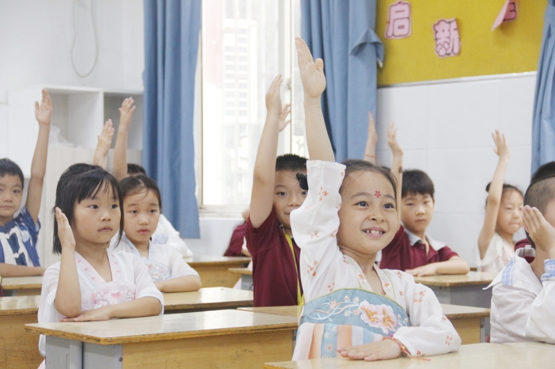 在端午知識(shí)小競賽中,同學(xué)們踴躍舉手發(fā)言,現(xiàn)場氣氛活躍。老師還給回答正確的同學(xué)系上五色繩。