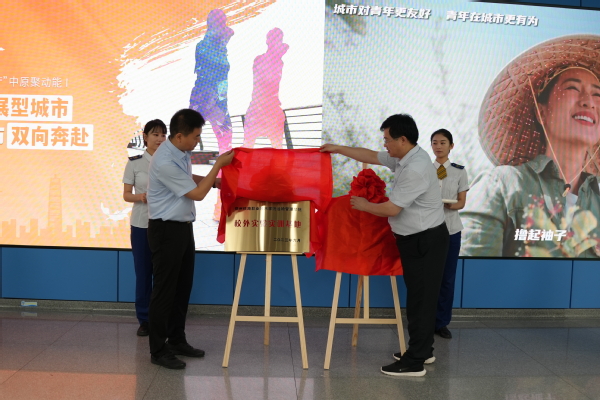 徐宏平與張紅欣共同為“鄭州鐵路職業(yè)技術(shù)學(xué)院運(yùn)輸管理學(xué)院校外實(shí)驗(yàn)實(shí)訓(xùn)基地暨青年志愿服務(wù)站”揭牌。