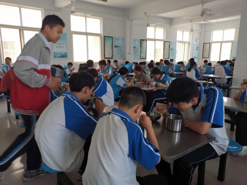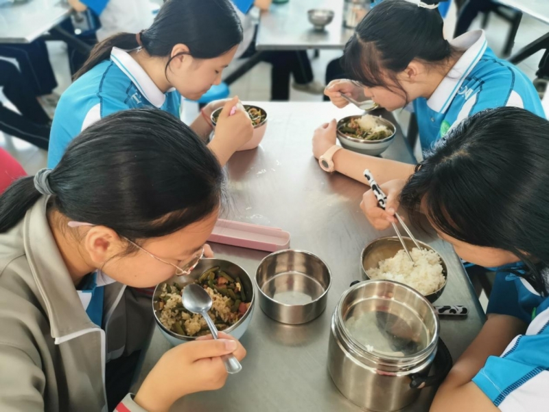 “平常放學(xué)到家,父母已經(jīng)把飯菜放到餐桌上了。在這里,要和同學(xué)們一起到食堂排隊(duì)打飯。”七(20)班盧帥同學(xué)頗有感觸。