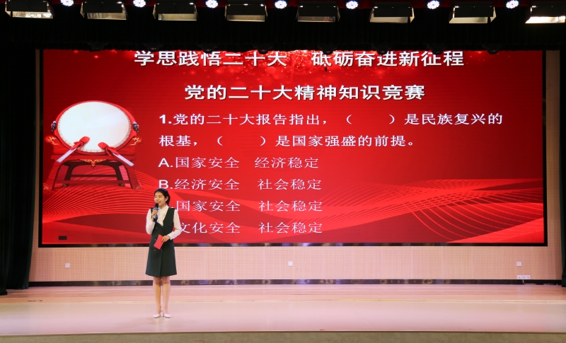 學(xué)校黨員、團(tuán)員教師也用實(shí)際行動(dòng)為黨獻(xiàn)上自己的祝福。飽含深情的表演將活動(dòng)帶向了高潮,老師們揮動(dòng)著手中的五星紅旗,感受著在黨的領(lǐng)導(dǎo)下的幸福生活,情不自禁地跟著唱了起來。在精彩節(jié)目間隙,還穿插了“黨的二十大精神知識(shí)競(jìng)賽”環(huán)節(jié),搶答環(huán)節(jié)氣氛緊張熱烈,老師們完美的作答令現(xiàn)場(chǎng)掌聲不斷。
