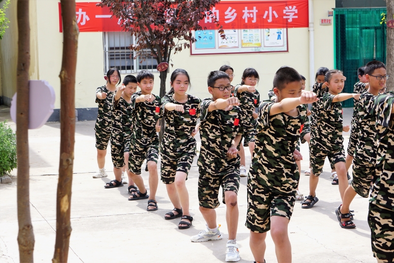 同時,“小水滴”支教團依托華北水利水電大學(xué)軍事社團華水新鐵軍的力量開設(shè)了國防教育課。在烈日驕陽下,在聲聲口令里,孩子們時而弓步?jīng)_拳、時而轉(zhuǎn)身別臂,動作剛勁有力。鏗鏘有力的呼喝、干凈利落的拳腳,充滿自信的微笑,充分展現(xiàn)了學(xué)生的活力和魅力。
