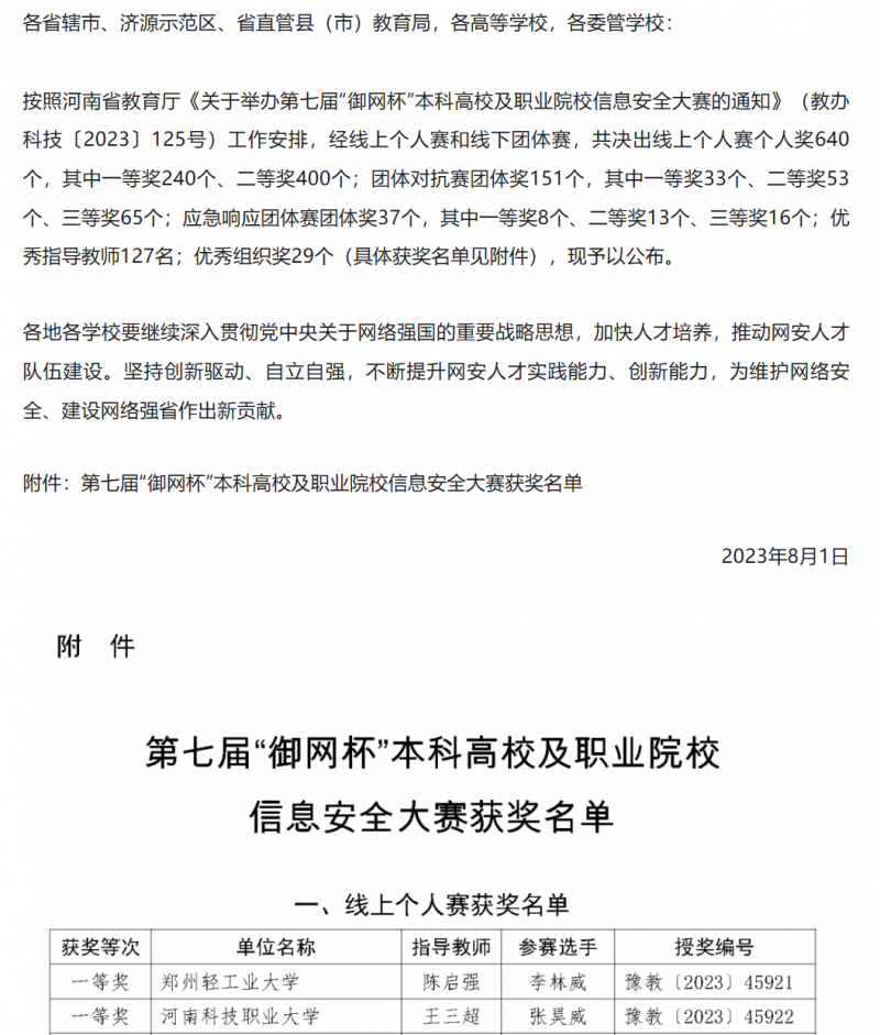 近日,河南省教育廳發(fā)布了《關(guān)于舉辦第七屆“御網(wǎng)杯”本科高校及職業(yè)院校信息安全大賽的通知》(教辦科技〔2023〕125號),經(jīng)過激烈的線上個(gè)人賽和線下團(tuán)體賽,鄭州科技學(xué)院特殊教育學(xué)院2020級電子信息工程(特殊教育)專業(yè)聽力障礙學(xué)生鄧嘉帥和同專業(yè)2021級學(xué)生常城振分別榮獲全省一等獎(jiǎng)和二等獎(jiǎng)。