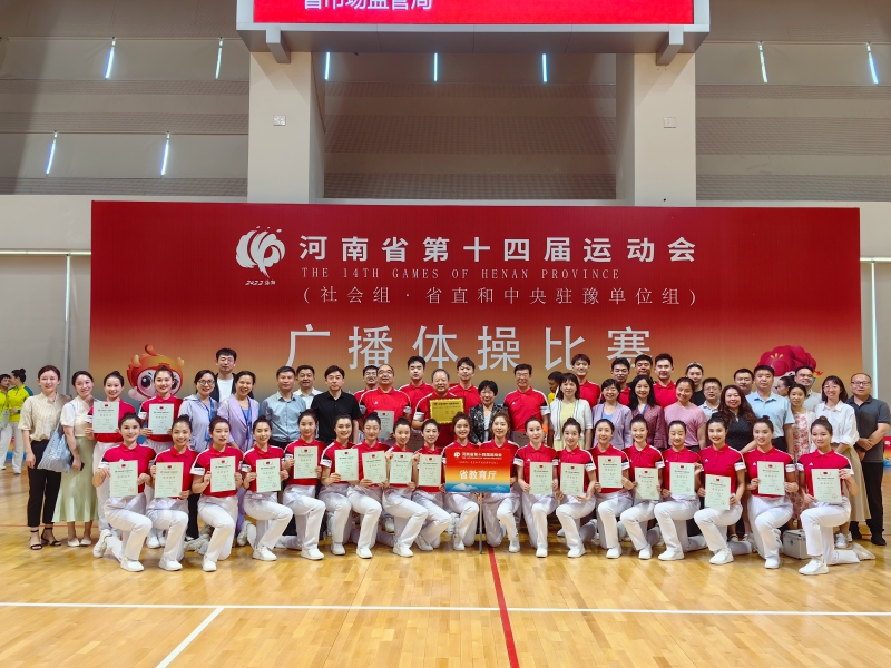 8月24日,河南省第十四屆運(yùn)動(dòng)會(huì)暨第八屆殘疾人運(yùn)動(dòng)會(huì)“社會(huì)組·省直和中央駐豫單位組”廣播體操比賽在河南省職工文體中心落下帷幕。省教育廳代表隊(duì)在省教育廳二級(jí)巡視員李培俊、曹克舜、胡萬欣的帶領(lǐng)下,全體隊(duì)員以飽滿的熱情、標(biāo)準(zhǔn)的動(dòng)作,不畏強(qiáng)手、頑強(qiáng)拼搏,充分展示了競(jìng)技水平和綜合實(shí)力,取得了一等獎(jiǎng)第一名的好成績(jī)。