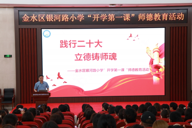 仿宋為深入學習貫徹習近平總書記關(guān)于教育的重要論述和全國、省、市教育大會精神,激勵廣大教師和教育工作者不忘初心,立德樹人,厚植愛國情懷,把思想政治與師德師風建設擺在教師隊伍建設的首要位置,通過塑造教師共同價值追求,激勵教師成為學生為學、為事、為人的“大先生”。根據(jù)上級工作部署,結(jié)合學校的實際情況,2023年8月24日上午,金水區(qū)銀河路小學組織全體教職工開展“開學第一課”師德教育活動。
