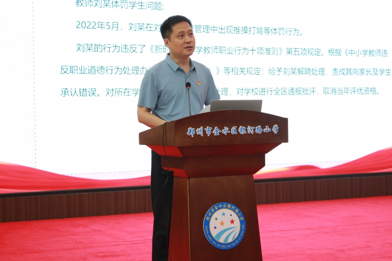 活動中,學校黨支部書記、校長劉均雅帶領全體教職工共同學習《鄭州市中小學教師違反職業(yè)道德行為處理實施細則(試行)》,要求教師統(tǒng)一思想,明確責任,自省自警,堅守師德底線。