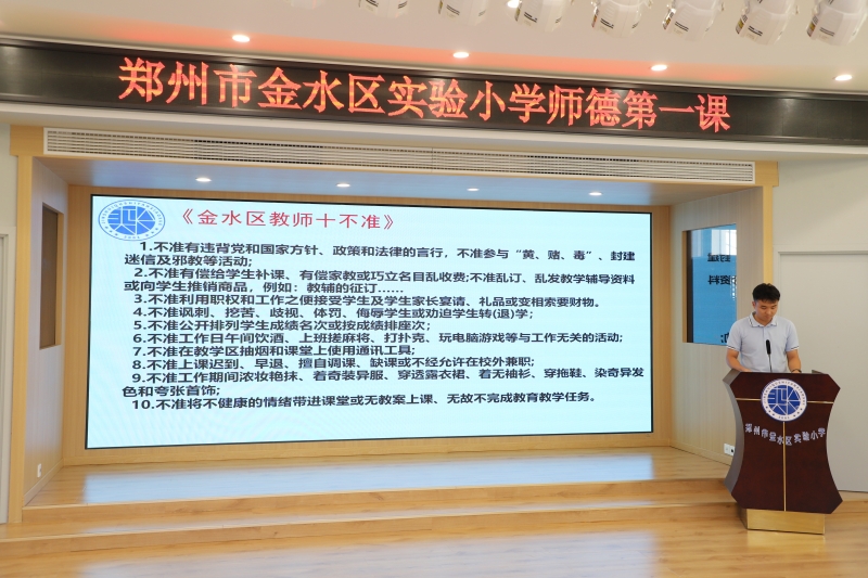 新教師頓棟欽代表帶領(lǐng)大家一起學(xué)習(xí)《金水區(qū)教師十不準(zhǔn)》。提醒大家要以更高更嚴(yán)的標(biāo)準(zhǔn)要求自己,時刻對照反思,切實增強遵紀(jì)守法的思想自覺和行動自覺,堅守師德,以愛育人。