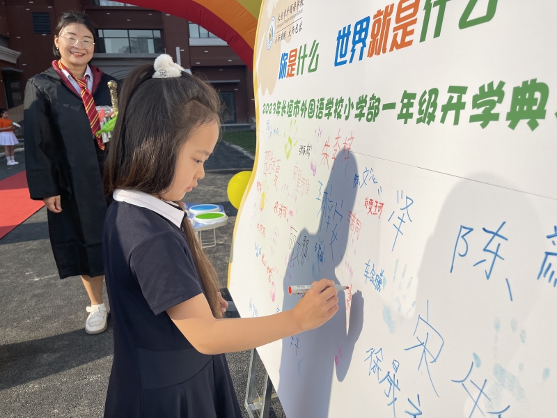 上午八點,一年級的學生盛裝出席,穿著帥氣的宇航員制服、俏皮美麗的公主裙、酷酷的奧特曼裝……在爸爸媽媽的陪伴下踏上“入學毯”,走進“入學門”。孩子們一筆一畫在簽名墻上寫下自己的名字,按上自己的小手印,照片定格了一張張可愛的笑臉。