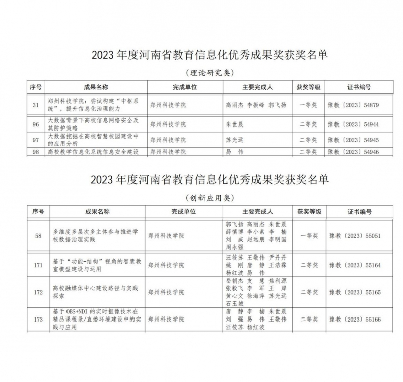 9月6日,記者從鄭州科技學(xué)院獲悉,在河南省教育廳下發(fā)的《關(guān)于公布 2023 年度河南省教育信息化優(yōu)秀成果獎獲獎名單的通知》中,對2023年度的河南省教育信息化優(yōu)秀成果獎獲獎名單予以公布。該校共有8項成果獲獎,其中理論研究類成果獲一等獎一項,二等獎三項;創(chuàng)新應(yīng)用類成果獲一等獎一項,二等獎三項。