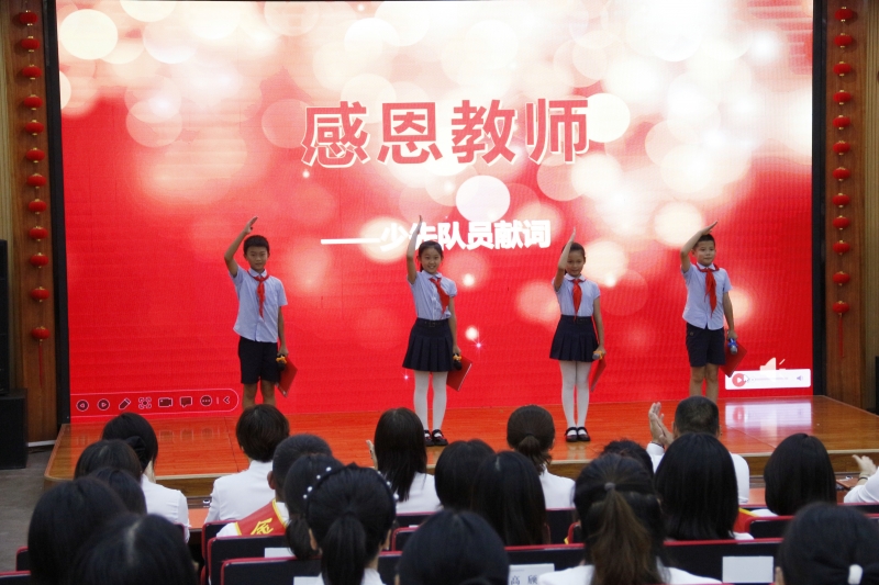 一段VCR送來(lái)了學(xué)生和家長(zhǎng)的祝福,看到視頻中老師們工作的畫(huà)面,聽(tīng)到家長(zhǎng)和學(xué)生對(duì)老師們表達(dá)的感謝,作為教師的自豪和幸福之情油然而生。接下來(lái),少先隊(duì)員代表為表彰大會(huì)獻(xiàn)詞。孩子們首先向老師們送上了節(jié)日的祝賀,同時(shí)以《感恩教師》為主題,向辛勤培養(yǎng)他們的老師表達(dá)了感恩感謝之情。熱情的演講贏得了在場(chǎng)老師們的陣陣掌聲。