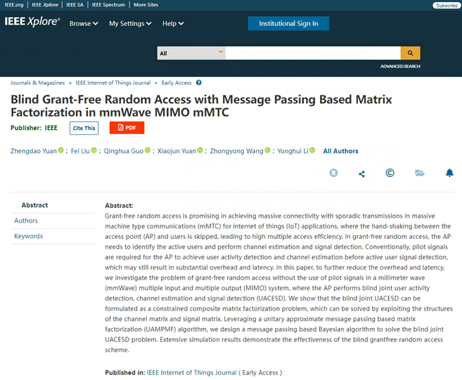 本月國(guó)際頂級(jí)期刊《IEEE Internet of Things Journal》(物聯(lián)網(wǎng))發(fā)表了河南開(kāi)放大學(xué)袁正道老師以河南開(kāi)放大學(xué)為第一作者單位的科研論文《Blind Grant-Free Random Access with Message Passing Based Matrix Factorization in mmWave MIMO mMTC》(基于矩陣分解的盲免接入隨機(jī)訪問(wèn)毫米波大規(guī)模機(jī)器通信模型)。該論文提出了面向6G中物聯(lián)網(wǎng)和空天一體化通信的數(shù)學(xué)模型與算法,從基礎(chǔ)上建模了大規(guī)模機(jī)器通信系統(tǒng)架構(gòu),對(duì)于6G通信及其物聯(lián)網(wǎng)應(yīng)用具有重要理論價(jià)值。發(fā)表該論文的《物聯(lián)網(wǎng)》期刊為中科院一區(qū),影響因子達(dá)10.6,這也是學(xué)校首次以第一作者單位發(fā)表影響因子破10的高水平SCI論文。