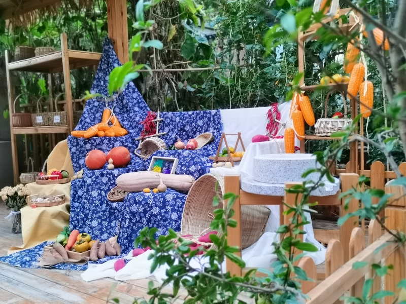 進門左手“一畝田”,盡滿生機與盎然。春時草長鶯飛,幼兒歡欣忙耕種;夏日生機勃勃,瓜果飄香老師與孩子盡情品嘗;秋來桂香四溢,滿園歡騰豐收忙;冬蘊美好期待,看書游戲靜享恬靜時光。在“一畝田”里觀四季美景,感教育之光,勤四體、識五谷、善觀察、樂探究、學謙讓、懂分享……,教育融入自然,成長自然發(fā)生。