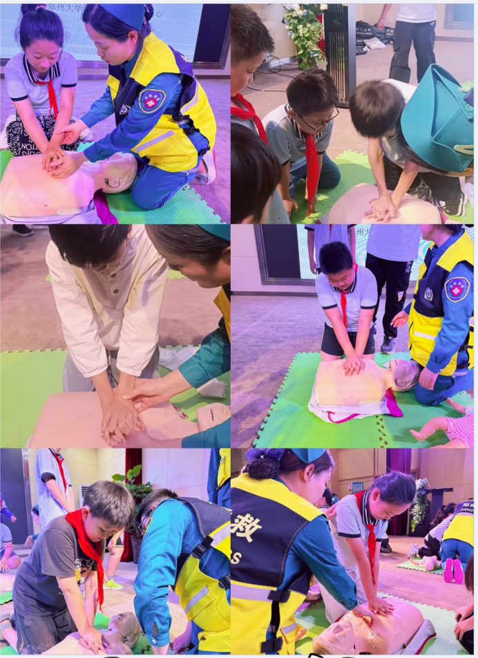 鄭大一附院急診醫(yī)學部急救中心任曉棟老師以法律支持為出發(fā)點,先是教授學生“怎樣正確撥打120”,緊接著孩子們通過清晰明了的數(shù)據(jù)了解到在遇到急癥時如若不能夠在“黃金時間”內采取恰當?shù)拇胧┍銜媾R著不同程度的損傷。任老師用幽默風趣的語言結合在生活中的實例為孩子們展開豐富多彩的急救知識內容及實踐操作。