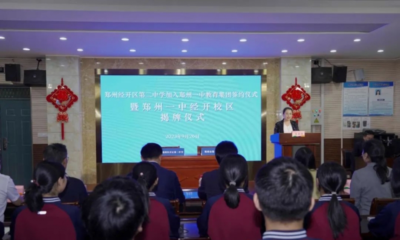 9月26日,鄭州經(jīng)濟技術開發(fā)區(qū)第二中學加入鄭州一中教育集團簽約儀式暨鄭州一中經(jīng)開校區(qū)揭牌儀式順利舉行。二級巡視員李國立、鄭州經(jīng)開區(qū)教育文化體育局負責人戴紅燕、鄭州一中校長閆培新、鄭州一中黨委書記吳建財、鄭州一中副校長王惠明、經(jīng)開區(qū)潮河辦事處黨工委書記陳偉、經(jīng)開區(qū)教文體局黨委委員周旭錦出席本次儀式。經(jīng)開區(qū)教文體局部分科室主任,濱河轄區(qū)小學校長,鄭州經(jīng)開區(qū)第二中學黨支部書記、校長李峰及部分師生和家長代表參加儀式。儀式由鄭州經(jīng)開區(qū)第二中學副校長樊麗娟主持。