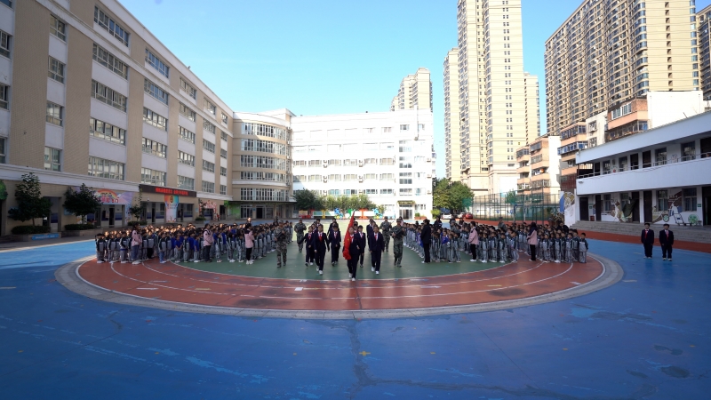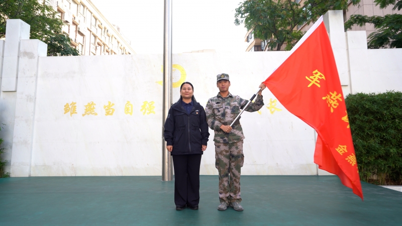 在莊嚴的升旗儀式后,學校黨總支書記宋璟向受訓教官授予學校“軍燕課程”旗,各班教官將象征各班榮譽的“軍旗”授予各班護旗手。