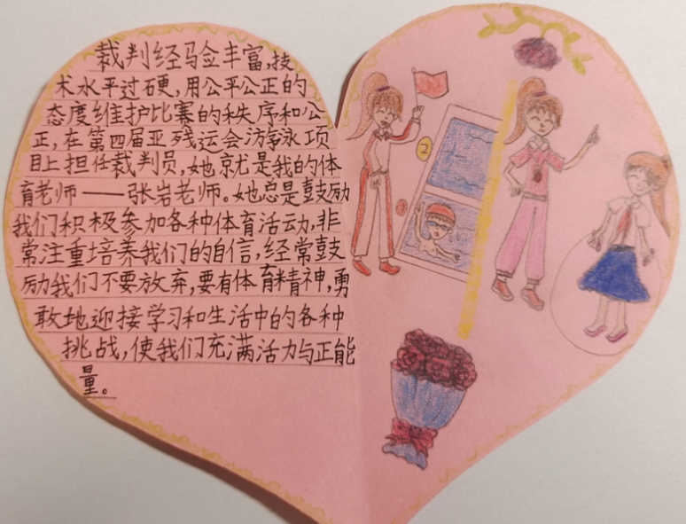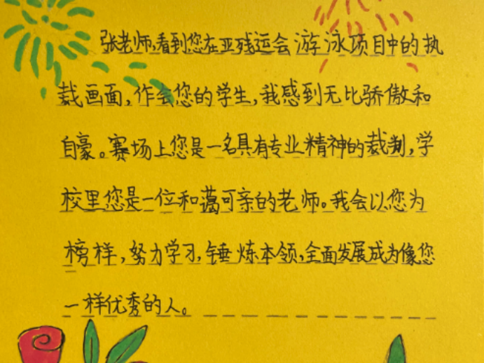 此次執(zhí)裁杭州亞殘運會的消息在校園中不脛而走,學生驚訝于張老師的神奇變身,也非常想念張老師。齊奕諾對張巖隔空喊話:“張老師,看到您在亞殘運會游泳項目中的執(zhí)裁畫面,作為您的學生,我感到無比驕傲和自豪。賽場上您是一名具有專業(yè)精神的裁判,學校里您是一位和藹可親的老師。我會以您為榜樣,努力學習,錘煉本領,成長為像您一樣優(yōu)秀的人。”