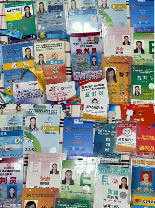 張巖執(zhí)裁比賽的證件,擺了滿滿一桌。