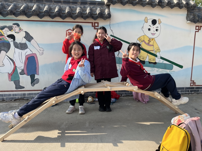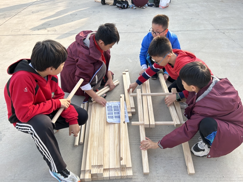 搭建榫卯結(jié)構(gòu)的虹橋是同學(xué)們最喜歡的項(xiàng)目。孩子們正是利用木棍仿照?qǐng)D中橋梁搭建的原理,小組成員協(xié)作搭“虹橋”。在搭建的過程中,孩子們不僅理解了力學(xué)原理,還明白了團(tuán)隊(duì)合作的重要性,更是對(duì)古人的智慧有了敬仰之情。