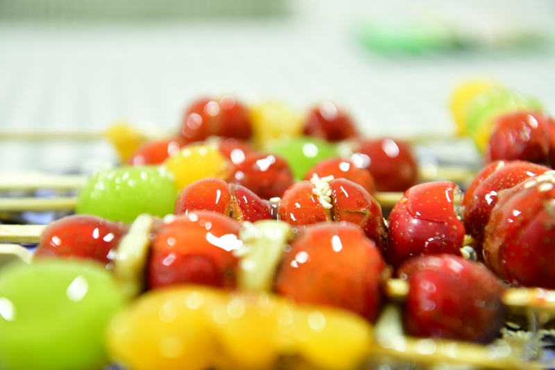 簡(jiǎn)單的學(xué)習(xí)后,便是學(xué)生們期盼已久的親自實(shí)踐了。同學(xué)們將摘好的山楂、葡萄、橘子等水果一起清洗干凈,切成大小合適的水果塊,根據(jù)自己的搭配靈感,用糖葫蘆簽子將不同水果塊串起來(lái),不一會(huì)兒,一串串色彩鮮艷的水果串就制作成了。