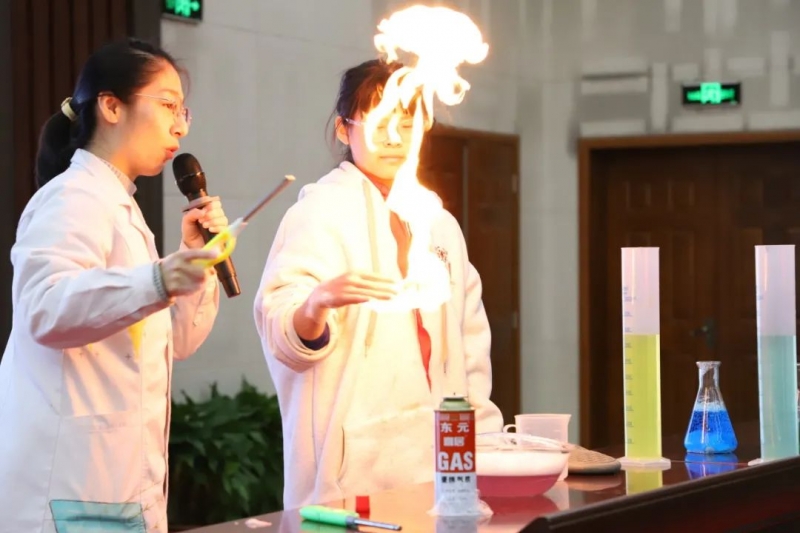 課堂上,孩子們近距離了解了干冰、丁烷等化學物質,領略了科學實驗帶來的視覺盛宴。鄭州科技館的水水老師將干冰放入不同顏色的液體中,白色的霧像噴泉一樣滾滾流下,妙不可言。水水老師還為前排的同學帶來了白色的“雪花”,引起了場上的陣陣驚呼。