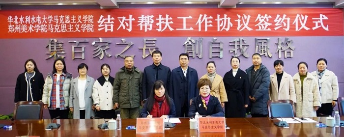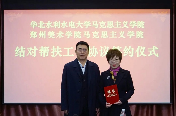 華北水利水電大學(xué)馬克思主義學(xué)院院長張梅在致辭中從學(xué)院概況、黨的建設(shè)、思政課教學(xué)改革、學(xué)科建設(shè)等方面介紹了學(xué)院基本情況,尤其重點(diǎn)分享了“三講四聯(lián)動”、“五個一”大思政課新體系、“尚德、鑒史、明理、筑夢、強(qiáng)國”實(shí)踐教學(xué)品牌、“手拉手”集體備課會、“行走的思政課”等思政教學(xué)優(yōu)秀案例。鄭州美術(shù)學(xué)院馬克思主義學(xué)院院長蔣蘭從課程設(shè)置、學(xué)時落實(shí)、實(shí)踐教學(xué)及思政作品展等方面進(jìn)行了匯報。張梅院長與蔣蘭院長共同簽署《華北水利水電大學(xué)馬克思主義學(xué)院和鄭州美術(shù)學(xué)院馬克思主義學(xué)院結(jié)對幫扶工作協(xié)議》。