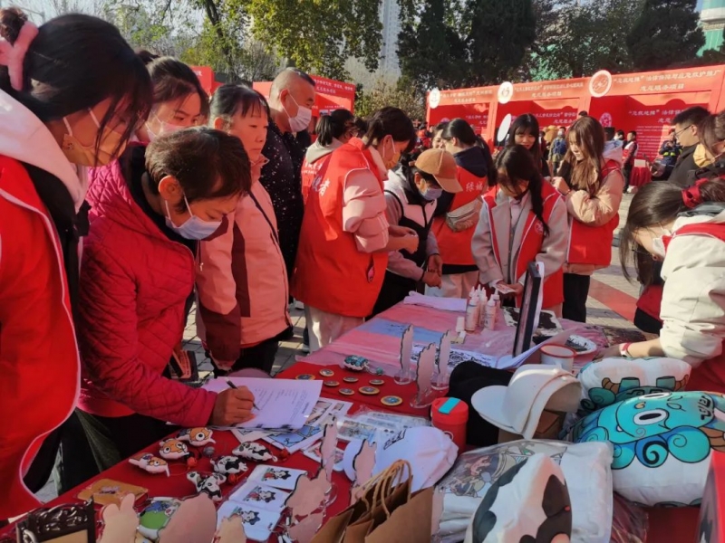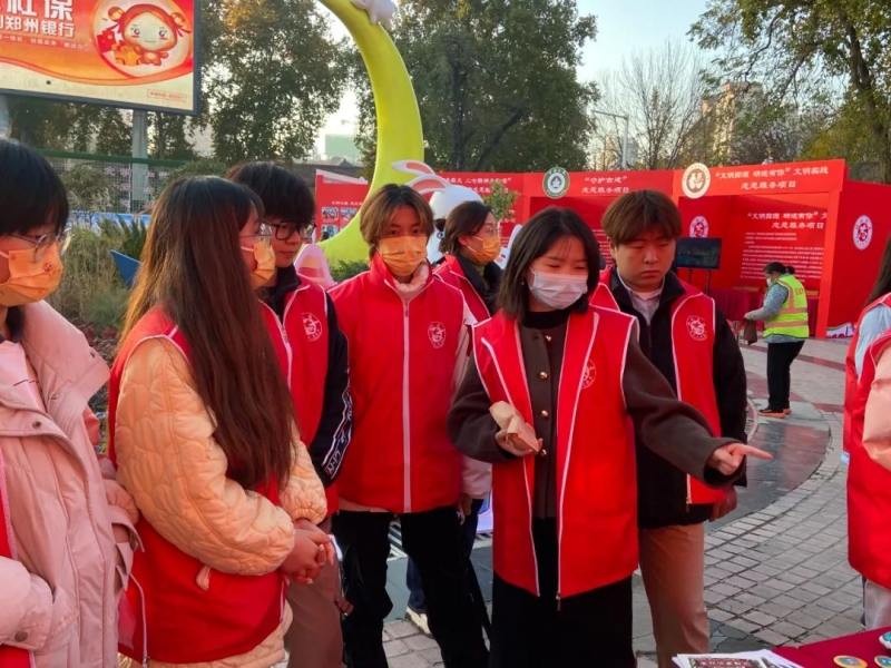 在項(xiàng)目展演現(xiàn)場(chǎng),指導(dǎo)老師朱訚、馮思源、閆晗、朱江帶領(lǐng)學(xué)生進(jìn)行非遺文化講解與體驗(yàn)、文創(chuàng)產(chǎn)品介紹。為了增強(qiáng)活動(dòng)效果,提升市民參與積極性,學(xué)校特別設(shè)置了集章打卡環(huán)節(jié),邀請(qǐng)市民參與非遺文化體驗(yàn)、河南文創(chuàng)現(xiàn)狀調(diào)研和環(huán)保知識(shí)問(wèn)答等活動(dòng),進(jìn)一步深化活動(dòng)主題,提升活動(dòng)成效。
