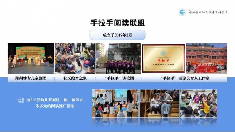 “手拉手閱讀聯(lián)盟”成立于2017年3月,以鄭州幼專兒童劇團(tuán)、鄭州幼專兒童戲劇研究中心、社區(qū)繪本之家、“手拉手”講讀團(tuán)、“手拉手”輔導(dǎo)員育人工作室為依托,向3~6歲幼兒開(kāi)展講、演、創(chuàng)等立體多元的閱讀推廣活動(dòng),旨在弘揚(yáng)中華優(yōu)秀傳統(tǒng),打造書(shū)香文化,培養(yǎng)學(xué)生成為全面發(fā)展的社會(huì)主義建設(shè)者和接班人。