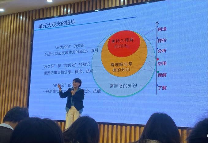 盧臻從“大單元教學(xué)教師要如何作為”“學(xué)習(xí)要如何設(shè)計(jì)”“課堂應(yīng)如何評(píng)價(jià)”三個(gè)方面解讀如何在課堂教學(xué)中逐步幫助學(xué)生建構(gòu)“專(zhuān)家思維”,指導(dǎo)教師們要成為教材的發(fā)掘者,帶領(lǐng)學(xué)生成為知識(shí)的建構(gòu)者、創(chuàng)造者。