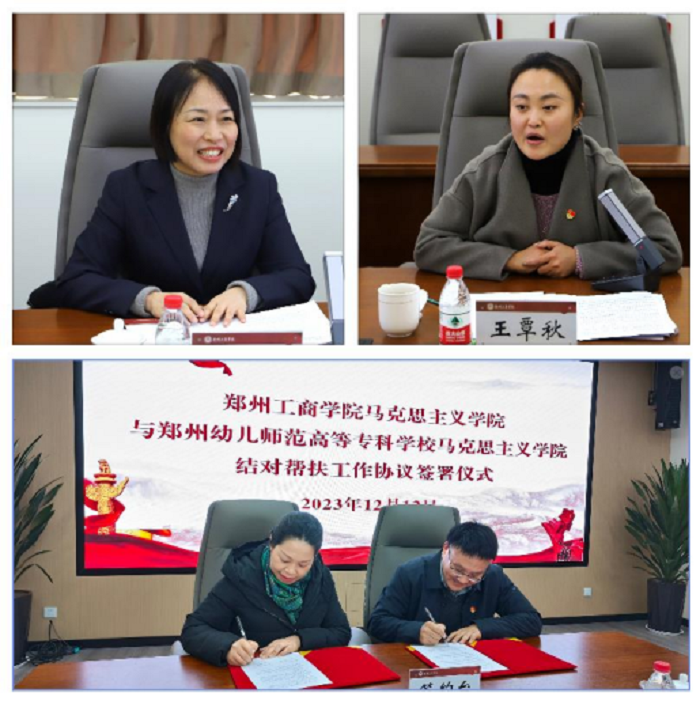 為持續(xù)貫徹落實(shí)全國全省高校思想政治工作會(huì)議、全國全省教育大會(huì)和學(xué)校思想政治理論課教師座談會(huì)等相關(guān)會(huì)議精神,探索構(gòu)建校際合作、資源共享的“大思政課”育人格局,12月12日下午,鄭州幼兒師范高等專科學(xué)校馬克思主義學(xué)院與鄭州工商學(xué)院馬克思主義學(xué)院在鄭州工商學(xué)院舉行了“結(jié)對幫扶共建”簽約儀式。鄭州工商學(xué)院副書記、副校長王覃秋,鄭州幼兒師范學(xué)校紀(jì)委書記劉蕤出席并參加了簽約儀式。簽約儀式由鄭州工商學(xué)院馬克思主義學(xué)院院長程明欣主持。
