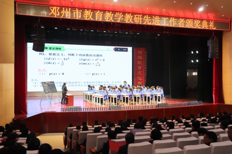 會(huì)上,與會(huì)嘉賓為獲得“南陽市十萬教師課堂教學(xué)大比武一等獎(jiǎng)”教師、“南陽市萬名班主任班會(huì)課大比武一等獎(jiǎng)”教師以及2023年秋期“優(yōu)秀教研組長”頒獎(jiǎng)。南陽市十萬教師課堂教學(xué)大比武數(shù)學(xué)組第一名鄧州市二高中程云老師講授示范課《函數(shù)的奇偶性》。獲獎(jiǎng)教師代表城區(qū)四初中楊嘉琪、城區(qū)十一小孟田、劉集中心校代瑩瑩依次分享了個(gè)人成長故事。