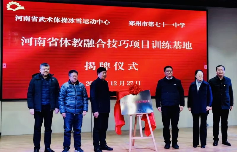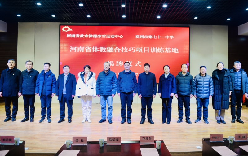 最后,河南省體育局青少年體育處副處長馬運(yùn)波,鄭州市教育局三級(jí)調(diào)研員花林昌,鄭州市體育局三級(jí)調(diào)研員劉苗俊,金水區(qū)文化旅游體育局副局長龐礴,金水區(qū)政府教育督導(dǎo)室副主任李榮成,鄭州市第七十一中學(xué)黨總支書記徐建志共同為“河南省體教融合技巧項(xiàng)目訓(xùn)練基地”揭牌,并合影留念。