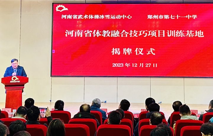 12月27日,鄭州市第七十一中學(xué)“河南省體教融合技巧項(xiàng)目訓(xùn)練基地”揭牌儀式在學(xué)校報(bào)告廳隆重舉行。河南省體育局青少年體育處副處長馬運(yùn)波、河南省武術(shù)體操冰雪運(yùn)動(dòng)中心主任晏猛、鄭州市教育局三級(jí)調(diào)研員花林昌、鄭州市體育局三級(jí)調(diào)研員劉苗俊、鄭州市教育局體衛(wèi)藝處處長馬勝宇、鄭州市體育局競訓(xùn)處處長趙轉(zhuǎn)折、金水區(qū)文化旅游體育局副局長龐礴、金水區(qū)教育局副局長胡培林、金水區(qū)政府教育督導(dǎo)室副主任李榮成、鄭州九中教育集團(tuán)校長張瑩、鄭州市少年兒童體育學(xué)校副校長王晉予,以及各啦啦操聯(lián)盟校的領(lǐng)導(dǎo)、教練、家長、學(xué)生代表80余人參加了活動(dòng)。