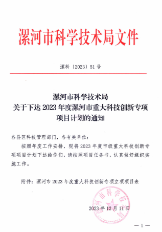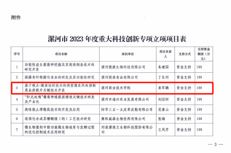 近日,漯河市科技局下達(dá)《2023年度漯河市重大科技創(chuàng)新專項(xiàng)項(xiàng)目計(jì)劃的通知》,漯河職業(yè)技術(shù)學(xué)院黨委書記易軍鵬教授主持的《基于碳點(diǎn)-微波協(xié)同技術(shù)的典型豫系風(fēng)味預(yù)制菜品質(zhì)提升關(guān)鍵技術(shù)開發(fā)》項(xiàng)目獲得立項(xiàng),獲得資金支持100萬元。