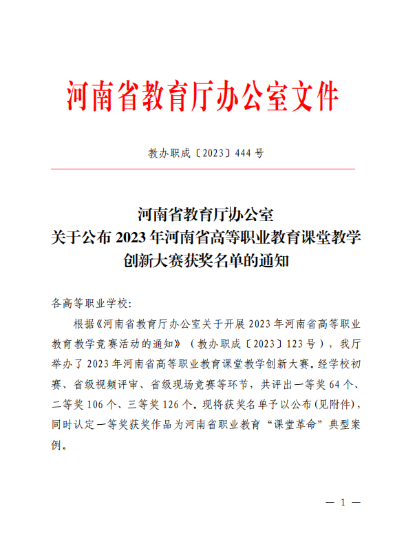 近日,河南省教育廳公布了2023年河南省高等職業(yè)教育課堂教學(xué)創(chuàng)新大賽獲獎(jiǎng)名單,河南開(kāi)放大學(xué)取得一等獎(jiǎng)1項(xiàng)、二等獎(jiǎng)2項(xiàng)、三等獎(jiǎng)2項(xiàng)的好成績(jī)。同時(shí),一等獎(jiǎng)獲獎(jiǎng)作品認(rèn)定為河南省職業(yè)教育“課堂革命”典型案例。具體見(jiàn)下表。