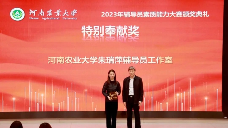副校長(zhǎng)楊喜田為河南農(nóng)業(yè)大學(xué)朱瑞萍輔導(dǎo)員工作室頒發(fā)“特別奉獻(xiàn)獎(jiǎng)”