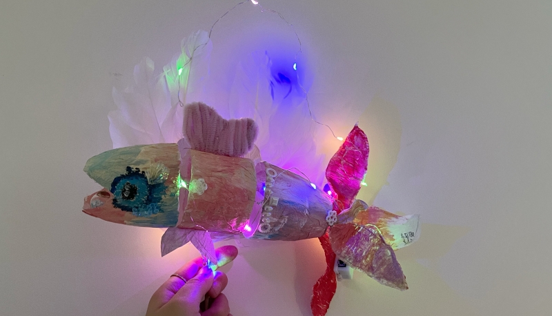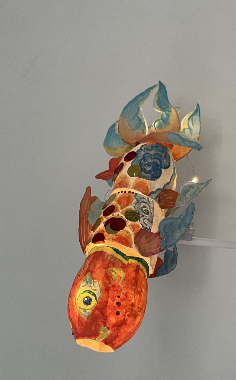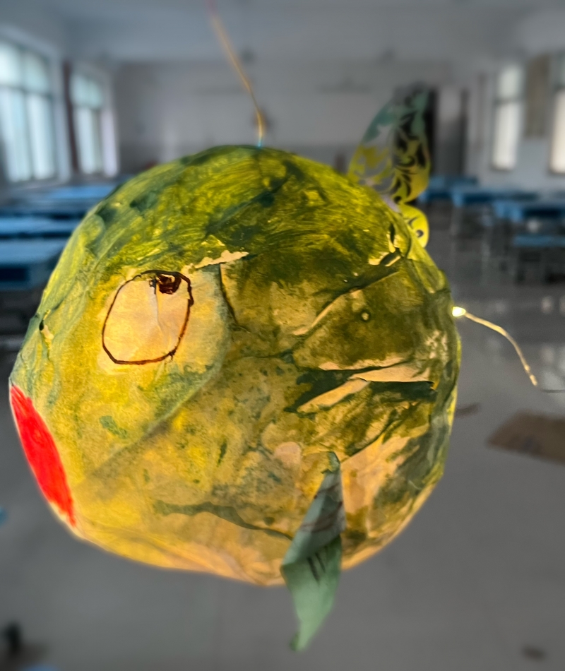 燈展上可以看到同學(xué)們精心制作的形態(tài)各異的魚燈。有活潑可愛的小鯉魚燈,有威猛霸氣的鯊魚燈,更有一些同學(xué)巧妙地將傳統(tǒng)與現(xiàn)代相結(jié)合,制作出了身著蕾絲裙的公主魚燈,宛若童話中的精靈,給人以夢幻般的感覺。千奇百怪的魚兒就好像各有特點的孩子一樣,在龍門的大家庭里快樂成長。這些魚燈以廢棄瓶子為骨架,采用生活中常見的各種材料制作,不僅富有創(chuàng)意,更是將中國傳統(tǒng)文化納入其中,無不展現(xiàn)著孩子們課上與課下的認(rèn)真與熱愛,充分體現(xiàn)了寓教于樂。