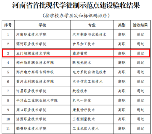 近日,根據(jù)河南省教育廳辦公室《關(guān)于公布河南省首批現(xiàn)代學(xué)徒制示范點(diǎn)建設(shè)驗(yàn)收結(jié)果的通知》(教辦職成〔2023〕469號(hào))文件,三門峽職業(yè)技術(shù)學(xué)院旅游管理專業(yè)順利通過驗(yàn)收。