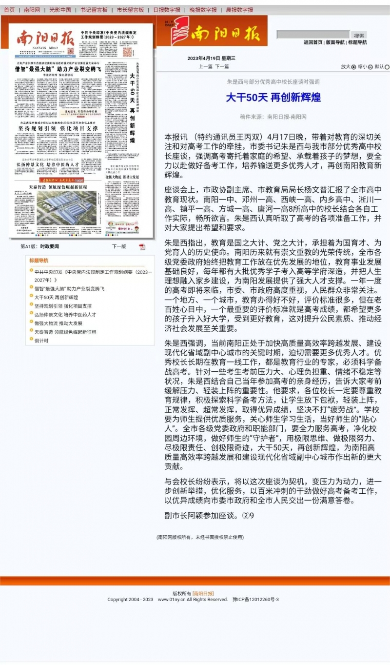 一、南陽市委書記朱是西與部分優(yōu)秀高中校長座談,提出大干50天,再創(chuàng)新輝煌的要求