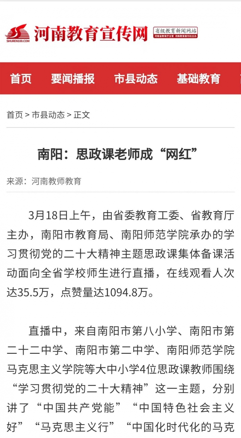 3月18日,由省委教育工委、省教育廳主辦,南陽市教育局、南陽師范學(xué)院承辦的學(xué)習(xí)貫徹黨的二十大精神主題思政課集體備課活動面向全省學(xué)校師生進(jìn)行直播,在線觀看人次達(dá)35.5萬,點(diǎn)贊量達(dá)1094.8萬。