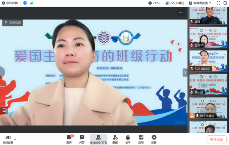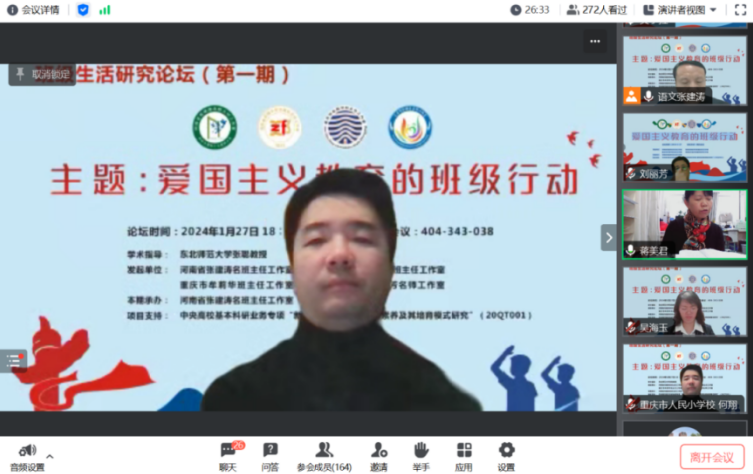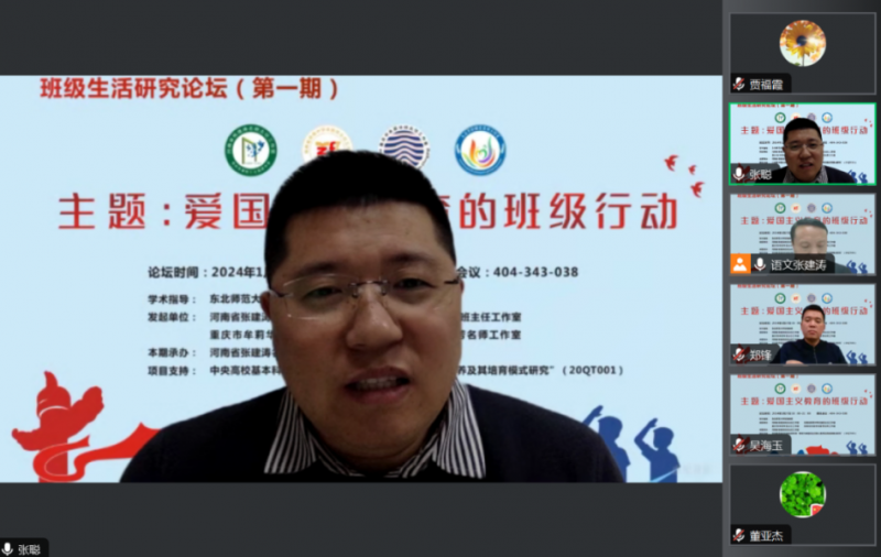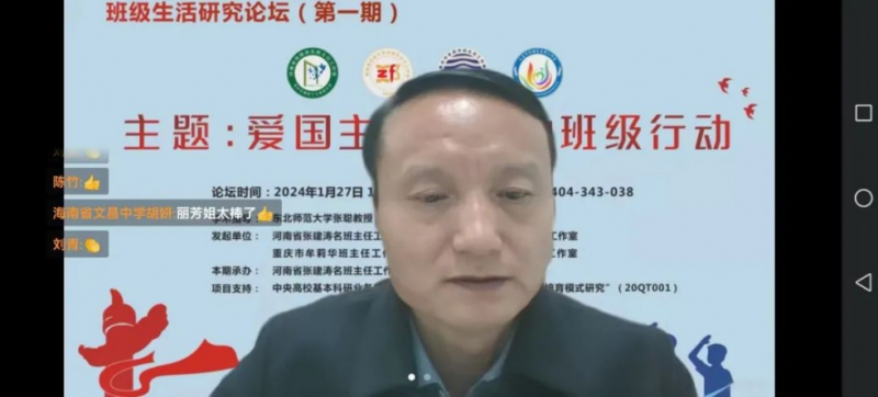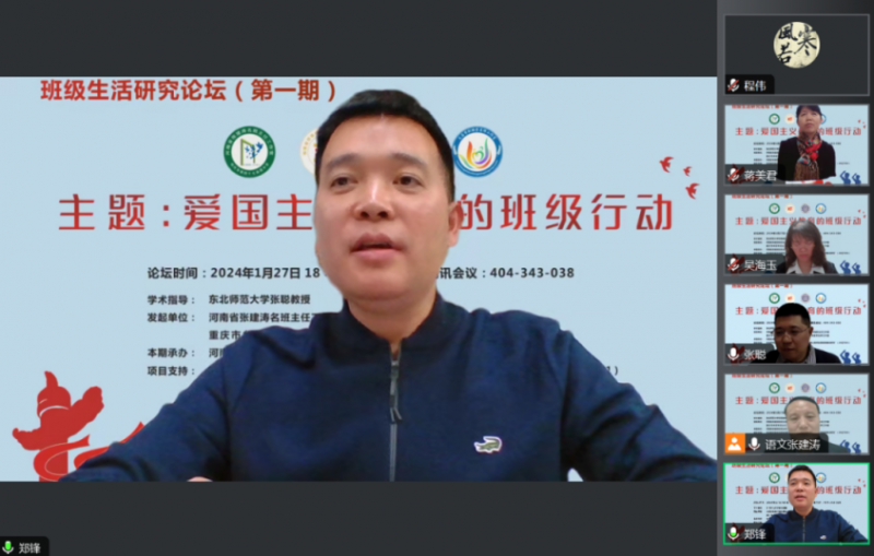 新年伊始,華章日新。2024年1月1日,《中華人民共和國愛國主義教育法》正式實施。為進(jìn)一步貫徹落實《愛國主義教育法》,推進(jìn)班級愛國主義教育的討論與交流,在東北師范大學(xué)張聰教授的指導(dǎo)下,1月27日,由河南省張建濤名班主任工作室、海南省鄭鋒中學(xué)卓越班主任工作室、重慶牟莉華班主任工作室、海南省文昌市劉麗芳名師工作室共同發(fā)起的“班級生活研究論壇”第一期成功舉行。本期活動以“愛國主義教育的班級行動”為主題開展跨區(qū)域線上研討,10余省份300多名教育同仁在線觀摩研討。