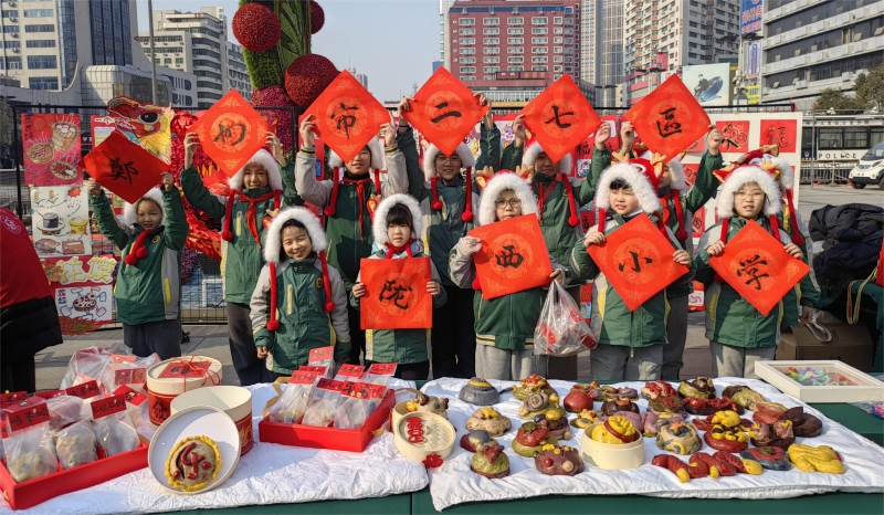 在一片喜慶的中國紅中,鄭州市二七區(qū)隴西小學(xué)的迎新年美術(shù)作品展吸引了許多旅客駐足觀賞。作品展之外,經(jīng)過包裝的花饃、學(xué)生扭扭棒作品,以及隴西教師親手書寫的福字對聯(lián),也吸引了過往行人的興趣。