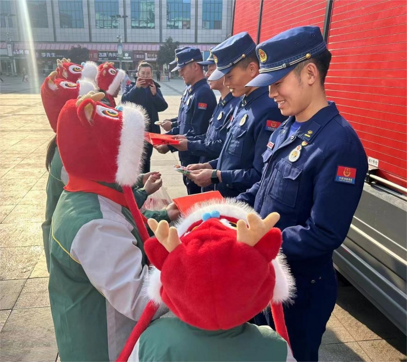 廣場不遠處,小“隴”人們也將新年的祝福送到消防戰(zhàn)士手中,他們是鄭州市消防救援支隊火車站大隊的消防人員。小“隴”人還化身小小消防宣講員,分發(fā)消防手冊,給身邊的行人宣講消防安全知識,使現(xiàn)場氣氛達到高潮。